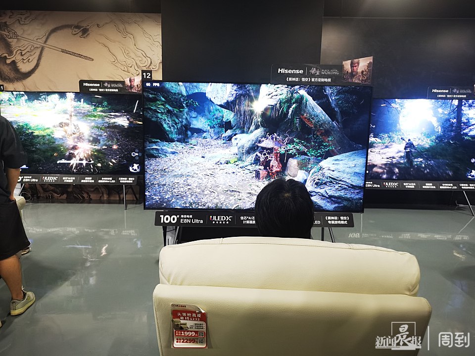 另一处试玩区体验方式则更为丰富,进门就能拿到相关周边,记者喜提一个“猪八戒”。进入门口,二十多个100寸的大屏幕前,已经有不少玩家在走剧情、打Boss。据工作人员表示,一侧为新手试玩区,限时20分钟试玩,另一侧为进阶通关区,限2条命。
