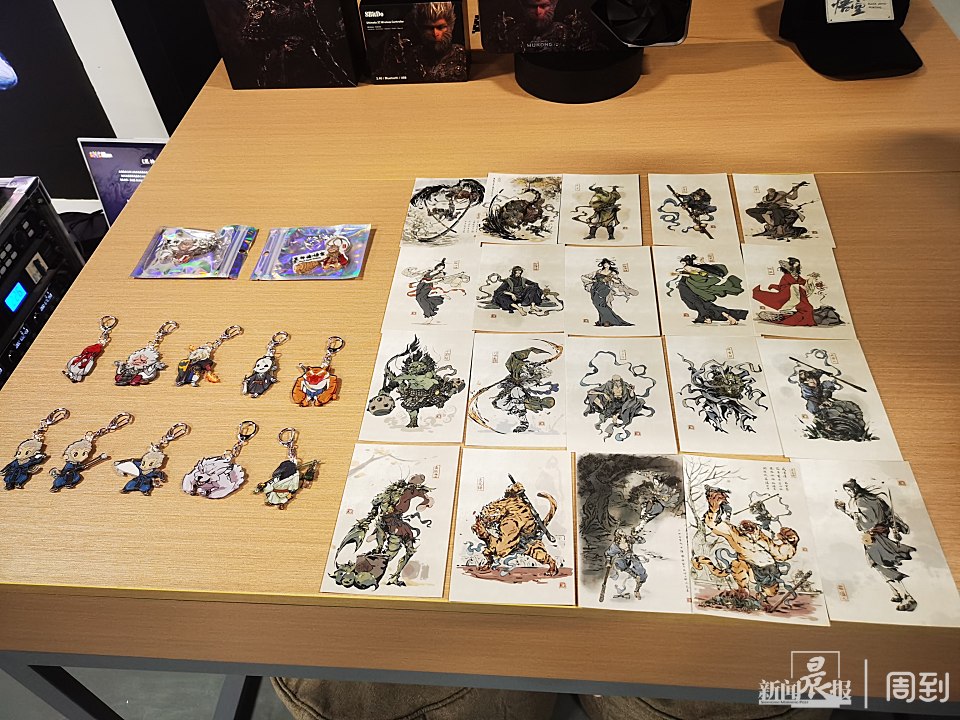 “这些是角色设定卡和人物的萌版周边,今天主要出现角色除了大圣还有广智、灵虚子,之后诸如蜘蛛精、蛇妖、糜道人等角色都会一一上线。”工作人员表示,今天展出的周边暂不售卖,但进门的大厅里有一款联名手柄正在同步发售中。