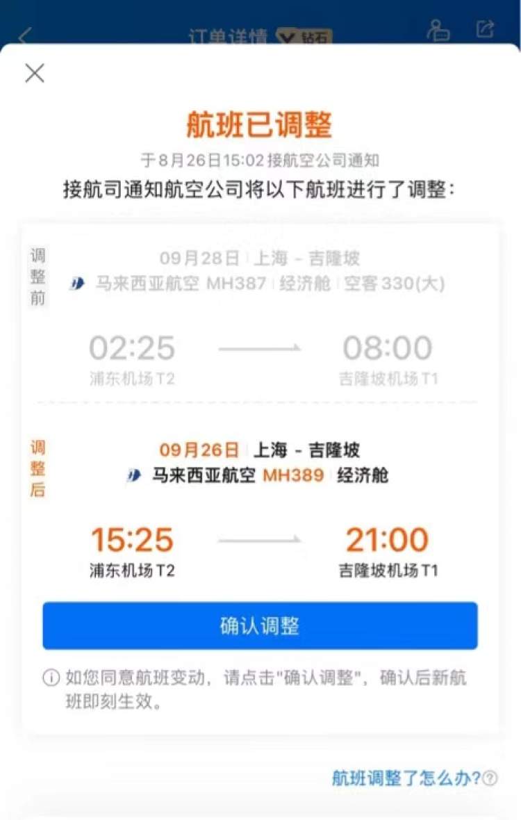 然而,计划赶不上变化。8月26日,购票平台通知王先生订票的那个马航航班,航司做了调整。王先生需要提前将近两天出发,搭乘马航MH389航班,也就是9月26日15:25出发,21:00到达吉隆坡。平台给出两种解决方案:要么改签,要么退票。如果改签马航指定外的航班,需要马航审核,申请结果不能保证。