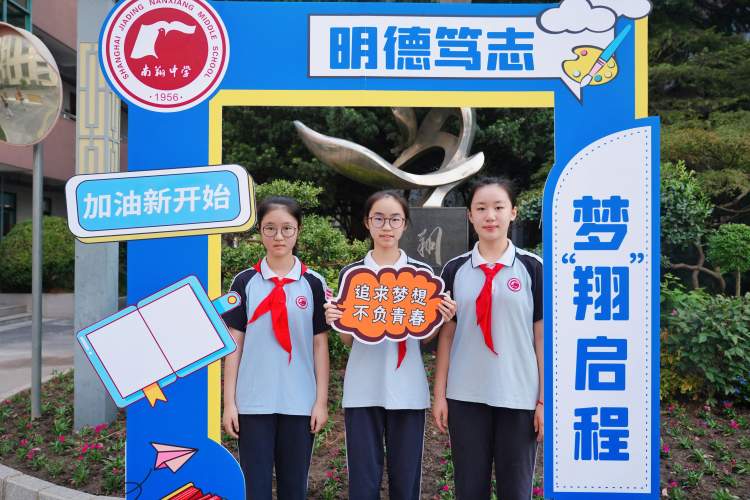迎着朝阳,早上7点,南翔中学迎来了元气满满的学生们。校门口和校内布置着开学氛围立牌,学生们纷纷合影留念,共同开启新一年的学习征程。