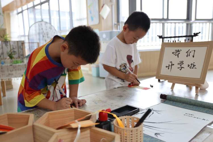 开学第一天,云翔幼儿园大班的幼儿用毛笔书写自己的名字进行签到,每个孩子都有不同的创意和想法,以最饱满的精神状态展现新学期全新的自己。