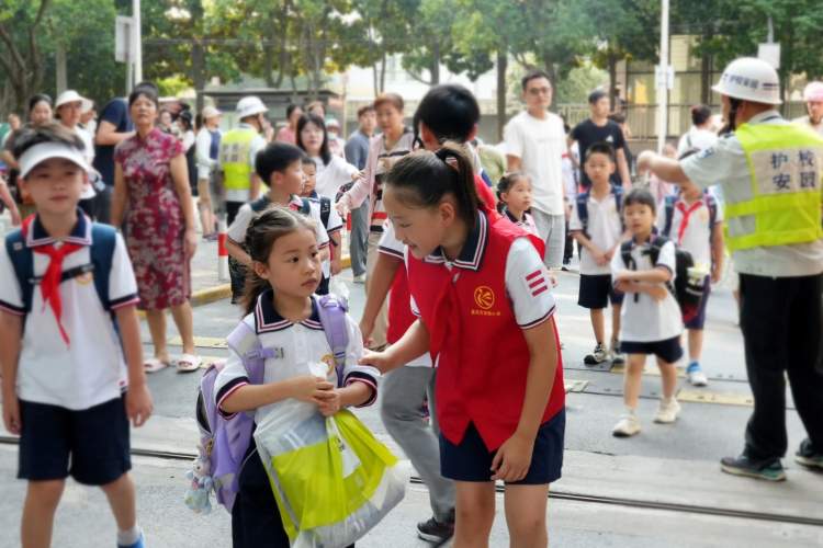 南翔小学的老师们带领着高年级的小志愿者们早早守候在校门口,为新入学的一年级学生指引路线。小志愿者们看到新生入校积极迎上前,一边牵着学弟学妹,一边还帮忙拎新校服,一路护送新生进教室。
