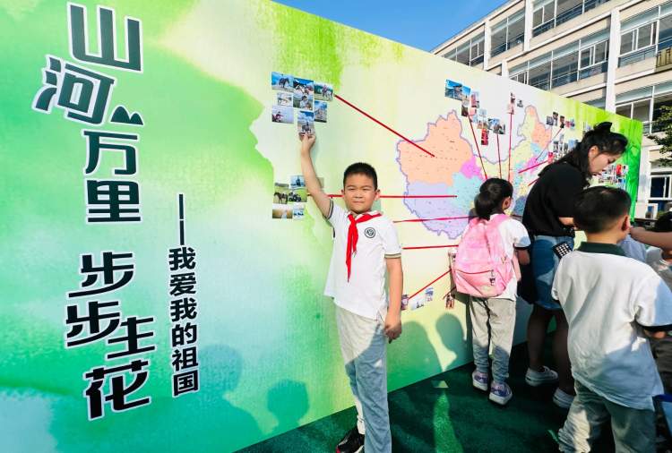 古猗小学打造了“山河万里 步步生花——我爱我的祖国”照片墙。学子们手持一张张“和美中国行”照片,将其贴在中国地图中相应的省市区域,分享着社会实践的经历。