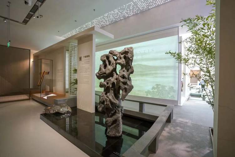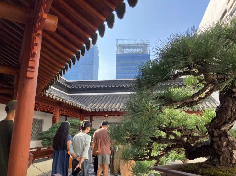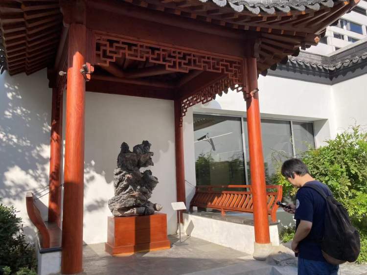 参观江南造物馆还有大彩蛋等着你,在江南造物馆出口一侧,有通往五楼屋顶花园的电梯,乘电梯观众将抵达拓展板块“东南之美——江南造物综合体验区”。体验区依托屋顶花园的仿古园林“云林”设计为沉浸式体验空间,巧妙运用仿古建筑与文物复制仿制等传统手工艺,真实再现江南园林、建筑及其室内外陈设的精致风貌,传递出江南工艺造物的综合美感。屋顶花园里目前有新开幕的“木石双清:江南石供与海派盆景展”。