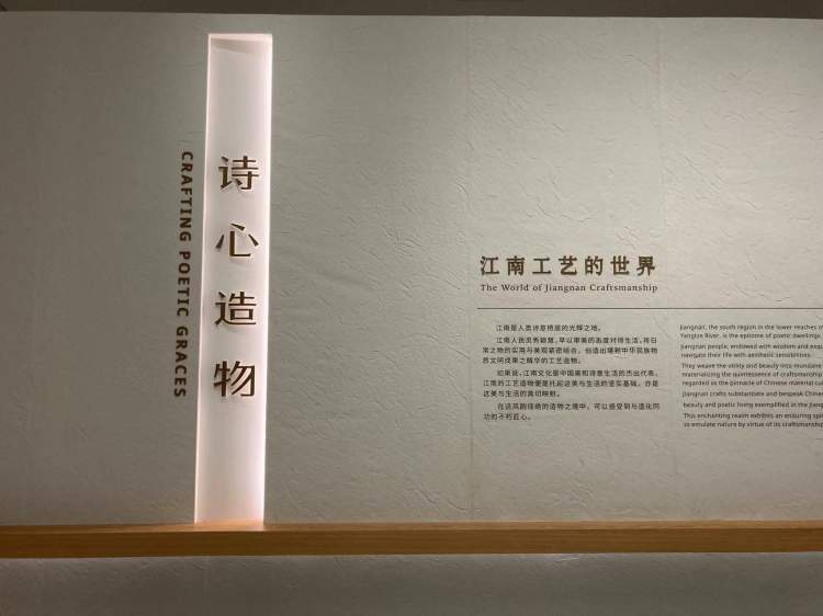 江南造物馆是一个常设展厅,常设“诗心造物——江南工艺的世界”主题展览,主旨是通过江南传统手工艺品的展示,为观众讲好江南文化故事。