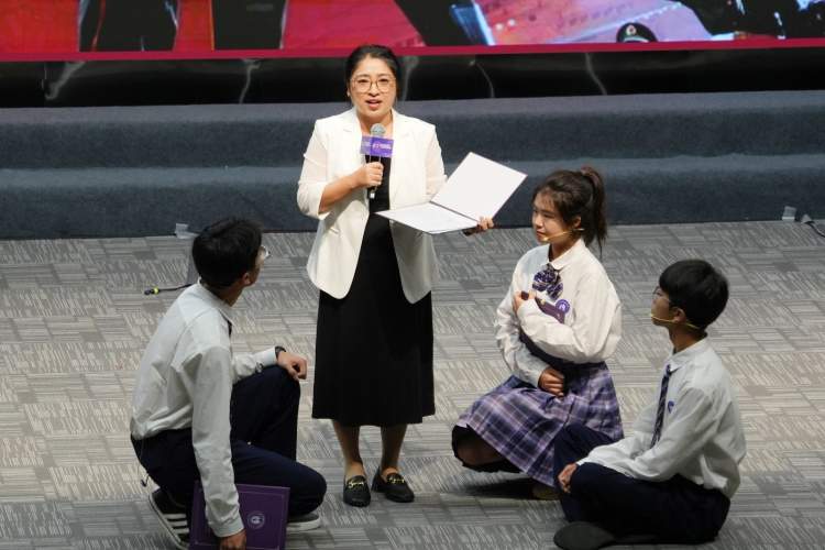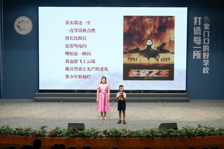 “老师,我们小组想通过电影小报的制作和展示,让更多同学了解试飞员们的故事。”“我们小组被张挺等人的故事所感动,又一起上网搜索到了影片创作时的人物原型,我们打算开一场英雄故事会。”上海大学嘉定基础教育集团带来了《影润成长》,小品中的李老师引导学生围绕电影《长空之王》展开深入的学习与讨论。学生们通过对比演唱、制作电影小报、开展英雄故事会等多种形式,不仅学习了影片内容,还巧妙地将各个学科知识融入其中,展现了责任与担当意识。