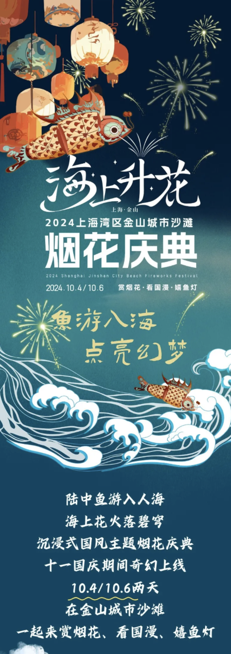 10月4日、10月6日,在金山城市沙滩,以“赏烟花、看国漫、嬉鱼灯”为主要内容的沉浸式国风主题烟花庆典,引入经典国漫元素以及鱼灯非遗文化,将传统与现代相结合,展现国漫风采,传递非遗之美,提升中华民族文化自信。