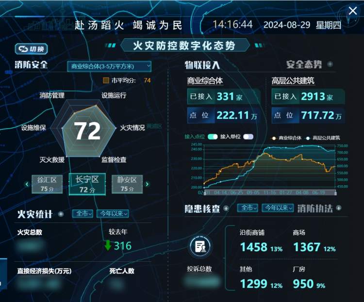 同时,该系统将高层建筑、大型商业综合体等重点单位3700余家的信息接入平台,并接入物联网点位1000余万个,建立接入情况评分模型,可以对社会单位进行远程在线管理和指导,实现数据资源的共享共用。