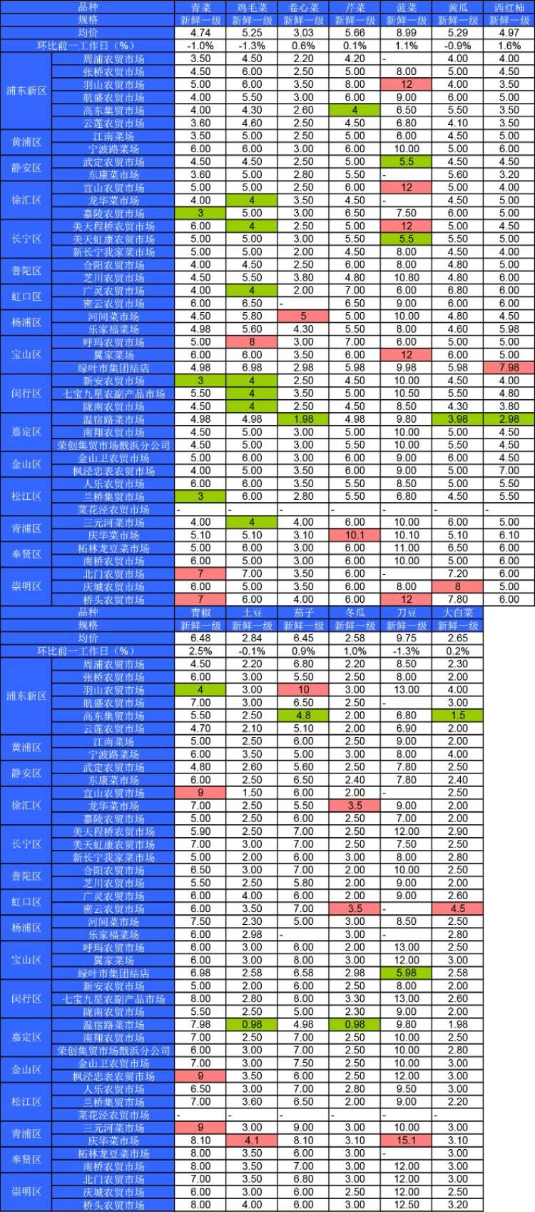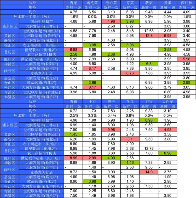 ■粉底标注代表该蔬菜品种在上述农贸市场或超市的最高价;绿底标注代表该蔬菜品种在上述农贸市场或超市的最低价。