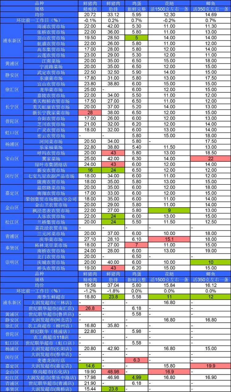 ■粉底标注代表该肉蛋鱼品种在上述农贸市场或超市的最高价;绿底标注代表该肉蛋鱼品种在上述农贸市场或超市的最低价。