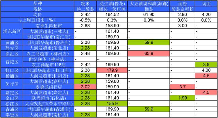 ■粉底标注代表该粮油品种在上述超市的最高价;绿底标注代表该粮油品种在上述超市的最低价。