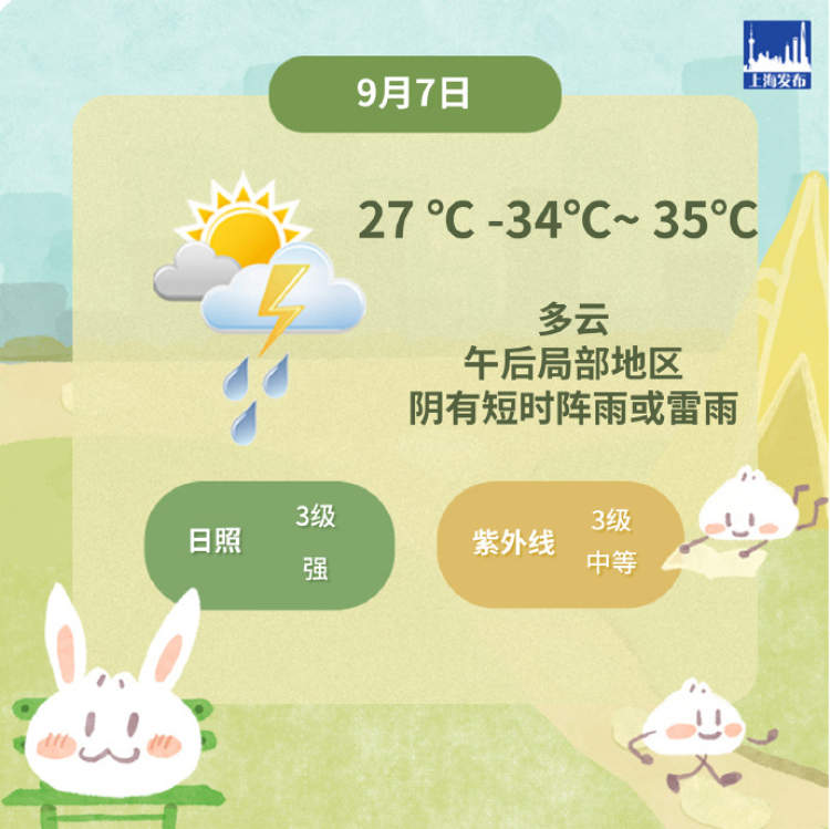 今天上海继续保持多云主场,午后局部地区阴有短时阵雨或雷雨,吹3-4级偏东风,全天气温27℃-34℃~35℃。暑热依旧没有退去,最高气温维持在34℃上下,早晚最低气温也有27℃-28℃。