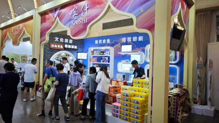 除了美食,本届展销会还首次创新呈现了喀什文旅融合的成果,不仅有上海交通大学设计院助力打造的喀什地区IP形象,基于十二木卡姆设计的系列文创产品,还展出了由非遗传承人制作的喀什铜器和木雕作品等。