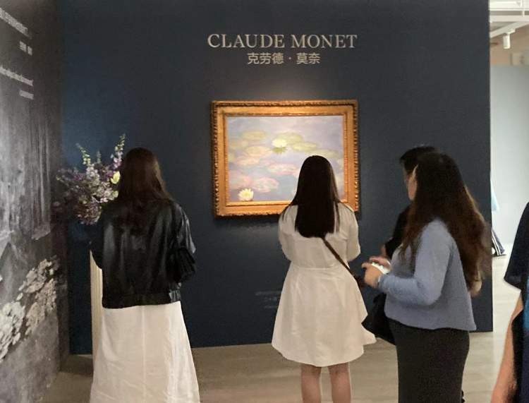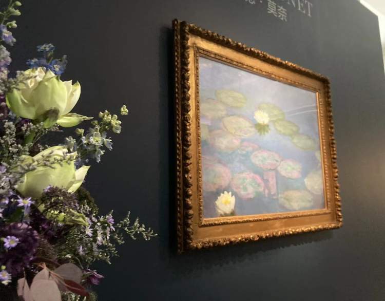位于中山东一路1号4层的佳士得上海艺术空间里,莫奈和梵高的名画分别被展陈在两个不同的展厅空间内。莫奈的《睡莲》悬挂于展厅一进门的正面墙上,而侧面墙上是莫奈在法国吉维尼池塘边的历史照片,放大占满了整个墙面,墙角还有一大盆鲜花。