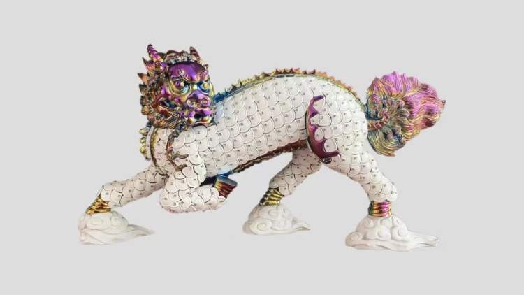 艺术家吴达新的参展作品《麒麟》,灵感来源于泉州开元寺中的麒麟壁。但他尝试将传统神兽做出具有当代感的艺术品。雕塑《麒麟》身上布满白色陶瓷制成的白色鳞片,并用一颗颗螺丝分别拧在每一片鳞片上,让其更具工业感,就像麒麟披上一身盔甲,显得更加威武。