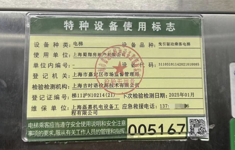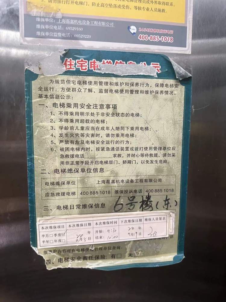 除了这个比较正式的牌子外,电梯内还张贴有一张蓝框白底的“住宅电梯信息公示”,在这则公示中,留有了一份电梯维保单位信息。信息显示,该电梯的维保单位为上海磊嘉机电设备工程有限公司。公示中附有该公司的应急救援400电话。