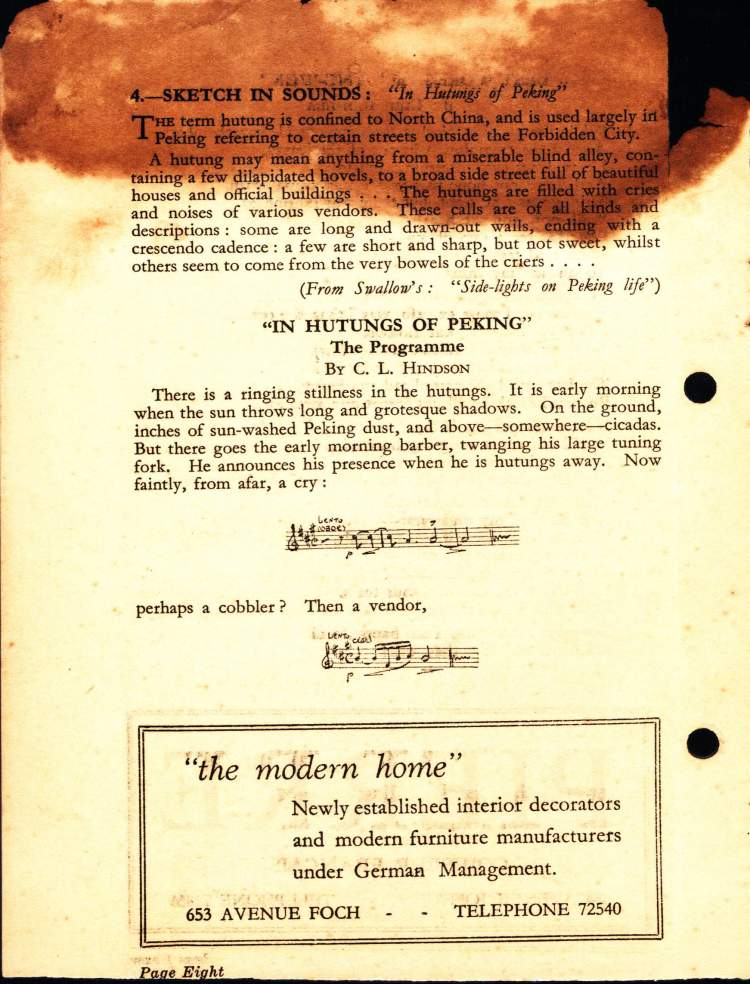1933年5月21日,上海工部局乐队演奏《北平胡同》曲目单