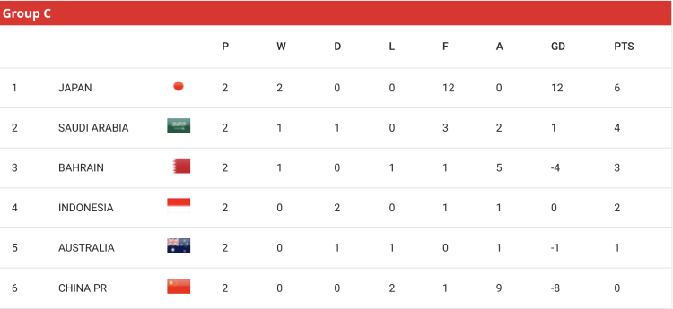 中国男足在昨晚以1比2负于沙特后,成为前两轮比赛中,C组唯一一支没有获得积分的球队。根据赛程,10月10日,中国男足将客场迎战澳大利亚队;五天后,中国队将在主场迎战目前取得两连平的印尼队。