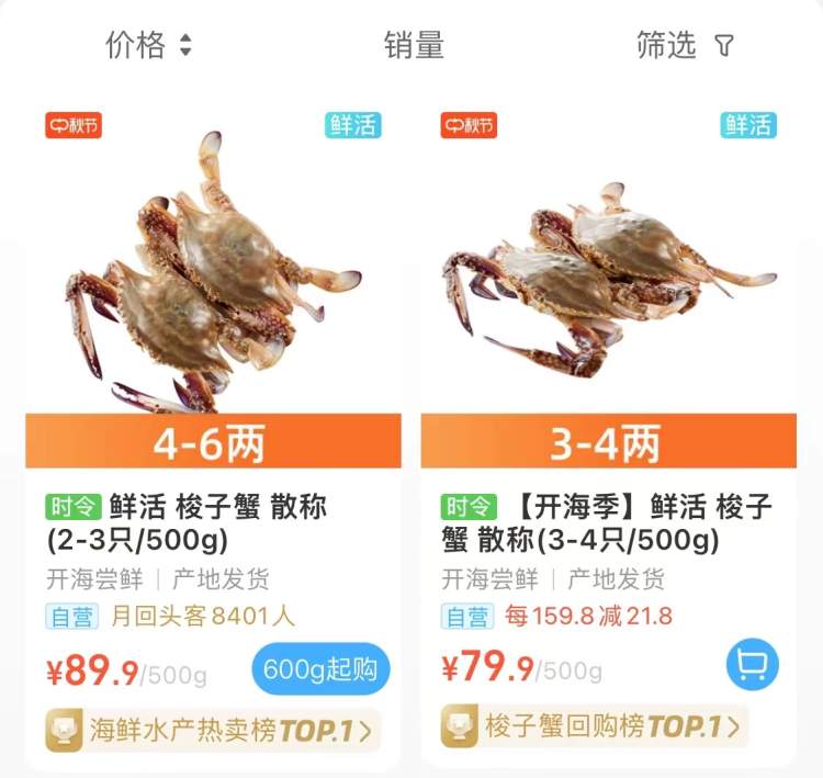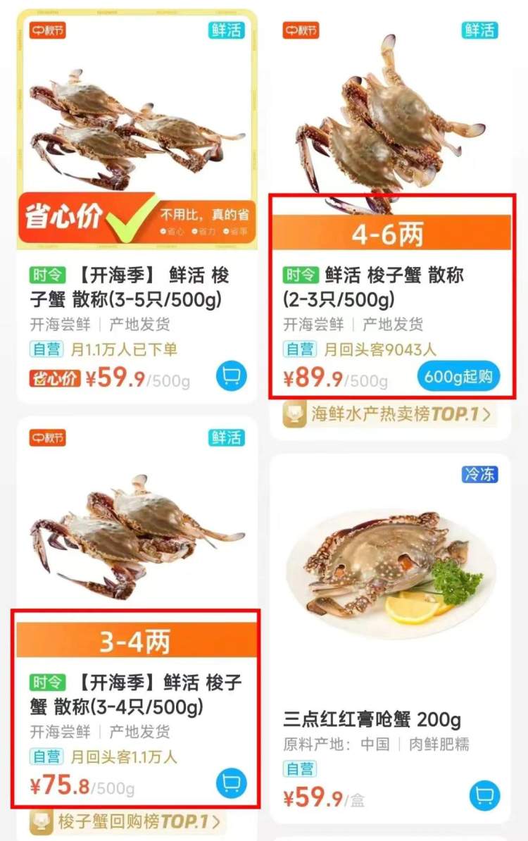 4天前,盒马平台,3-4只一两的鲜活梭子蟹价格为75.8元一斤,4-6两一只的鲜活梭子蟹为89.9元一斤。今天,3-4两一只的梭子蟹涨到了79.9元一斤,4-6两一只的价格维持不变。