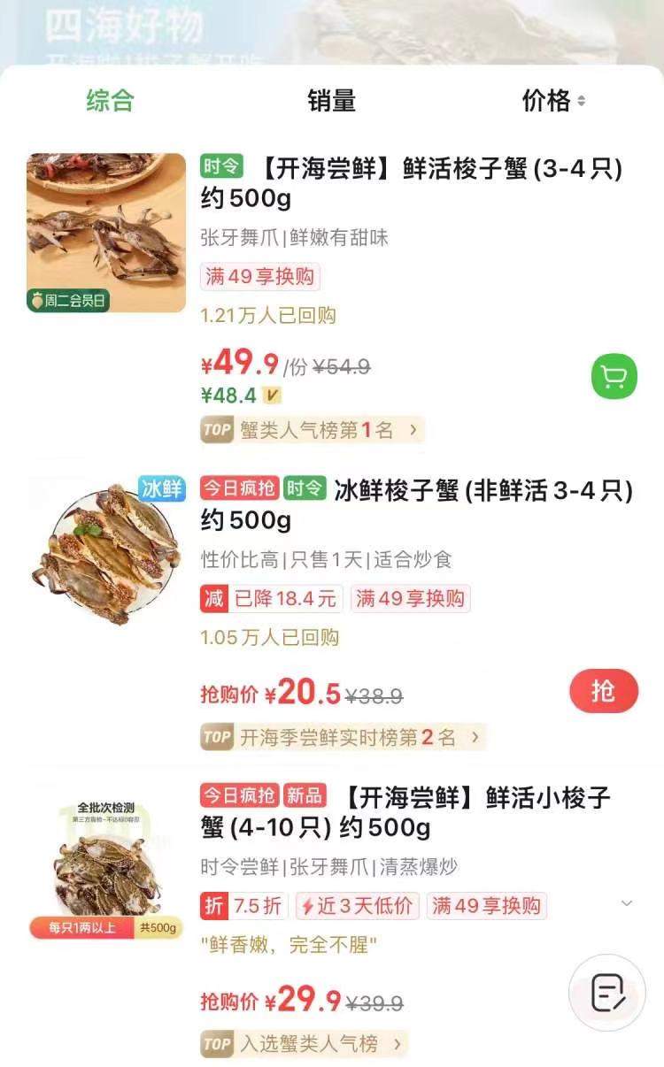 记者还发现,有时候,买菜平台的鲜活梭子蟹很早就会断货,推测与供货量不多也有关系。