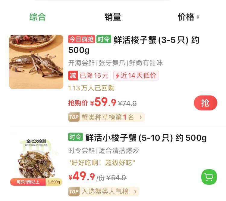 今天叮咚买菜梭子蟹的价格