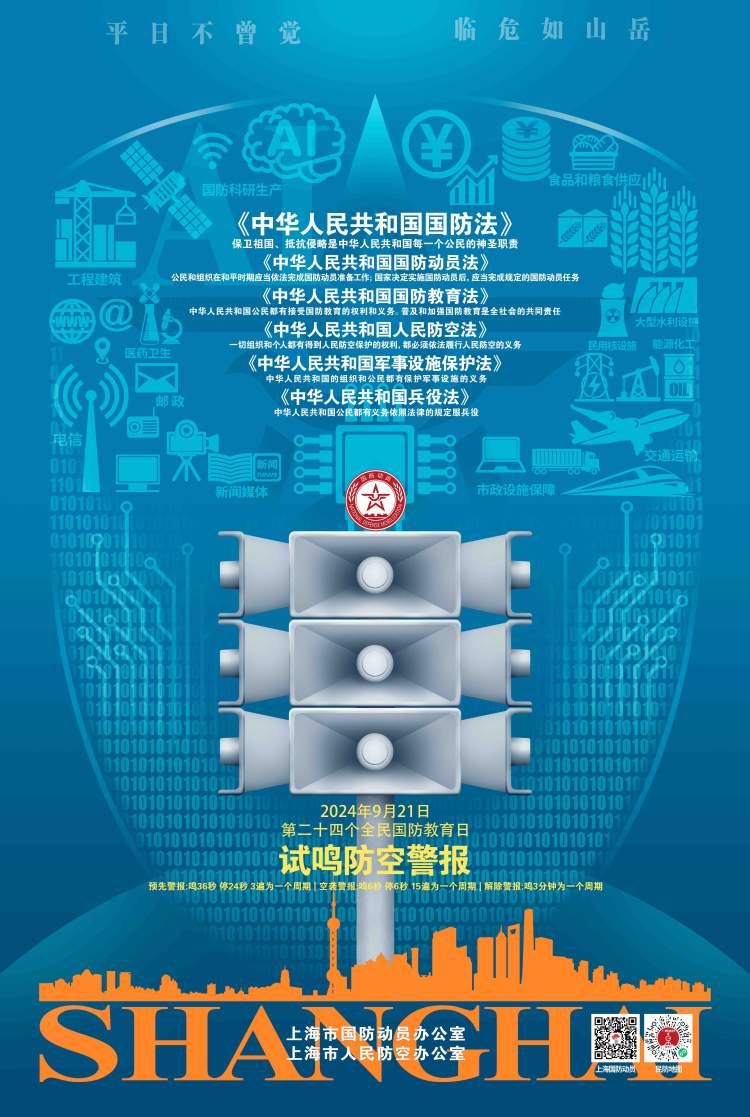 记者今日从市国防动员办公室了解到,9月21日,第24个全民国防教育日之际,上海将在全市范围内(除浦东国际机场、虹桥国际机场地区外)组织防空警报试鸣,并结合试鸣组织防空演练。