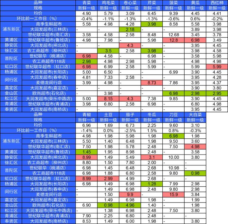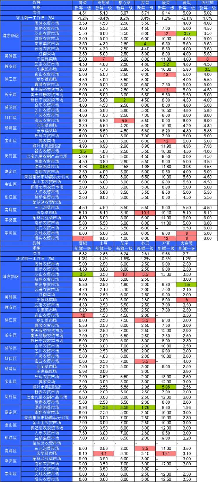 ■粉底标注代表该蔬菜品种在上述农贸市场或超市的最高价;绿底标注代表该蔬菜品种在上述农贸市场或超市的最低价。