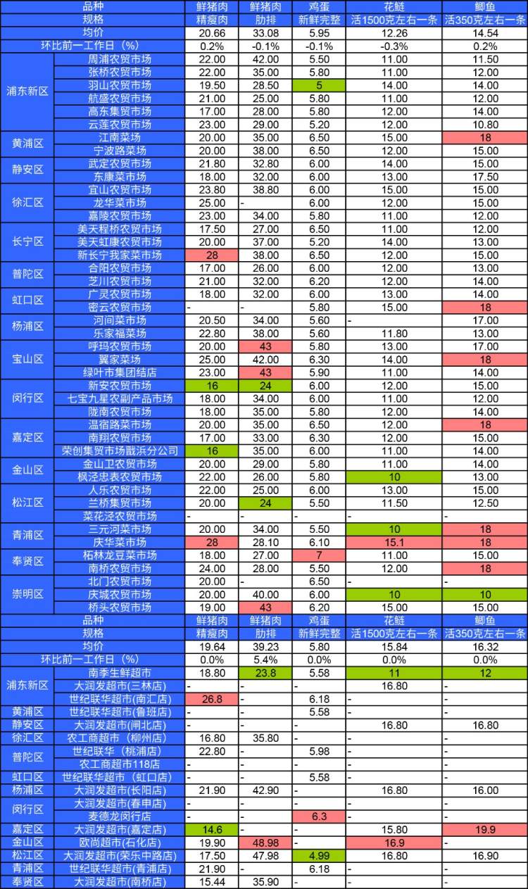 ■粉底标注代表该肉蛋鱼品种在上述农贸市场或超市的最高价;绿底标注代表该肉蛋鱼品种在上述农贸市场或超市的最低价。