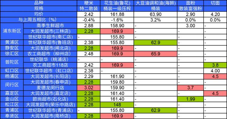 ■粉底标注代表该粮油品种在上述超市的最高价;绿底标注代表该粮油品种在上述超市的最低价。