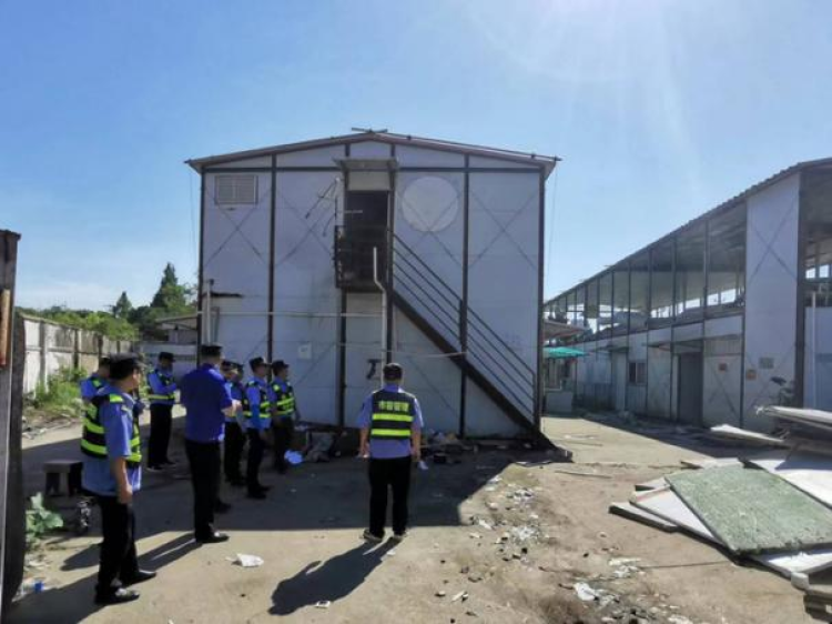 排查中,新虹中队通过街道规资所提供的材料发现,兴虹西路华涞路路口有两处建筑及辅助用房面积约1860平方米的钢结构板房。原先是涞港星苑小区建设项目的生活区和办公区,项目完工后,未及时拆除,仍在使用,属于违法建筑。