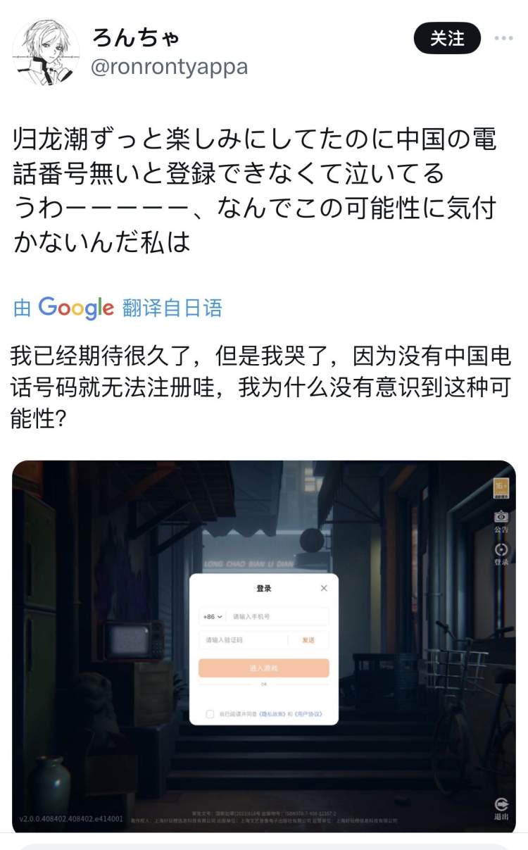 “这款中国游戏我已经期待很久了,但是今天我哭了,因为没有中国的手机号码就无法注册,我为什么没有意识到这种可能性呢?”来自日本的一位玩家特地在社交媒体上晒出了游戏的打开界面,因为目前还不支持海外玩家登录,公测当天的她有点小失落。不过游戏制作团队表示,《归龙潮》未来或将发行到海外市场,助力传统文化出海。
