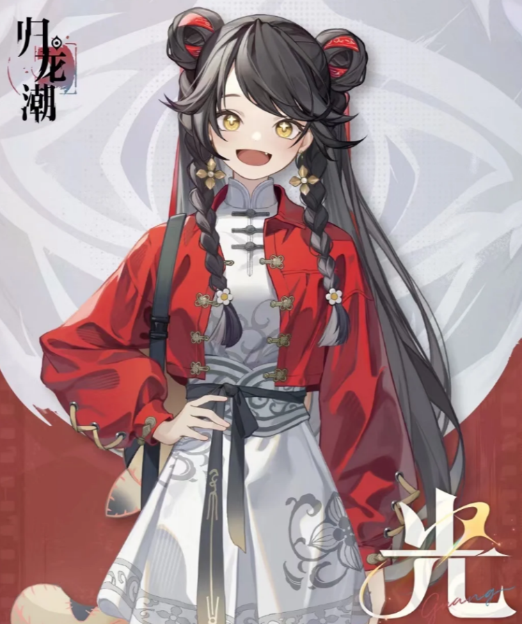 角色之一的光吸引了记者的目光,只见她身着含有旗袍元素的立领连衣裙,搭配着花朵形盘扣装饰的红色外套。同时,她的可爱熊猫丸子头发型也让记者眼前一亮:油亮的黑发中绑着印有金色图纹的丝带,尽显俏皮。