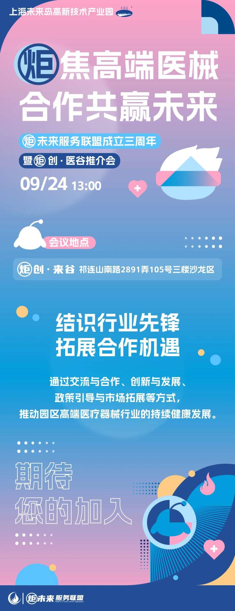 9月24日,未来岛园区将举办“‘炬’焦高端医械,合作共赢未来”主题活动,庆祝“炬”服务联盟三周年,并开展“炬”创·医谷推介会,诚邀新老朋友齐聚一堂,共享发展机遇、共谋美好未来。