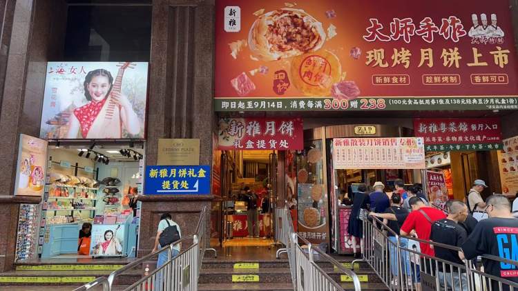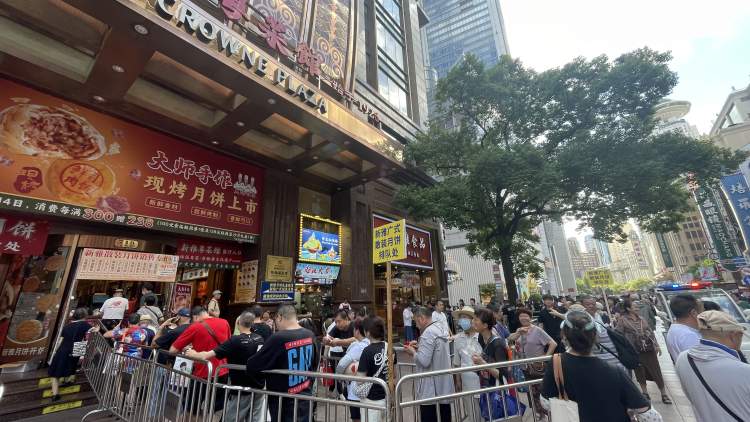 明天中秋假期就要开始了,今天是补班的周六,明明是工作日,但南京路步行街到处是排队购买月饼的人群,新雅、泰康、沈大成、邵万生……众多老字号门前,队伍少则一长条,多则几大截,问问时间,连午后都要排上两三个小时。