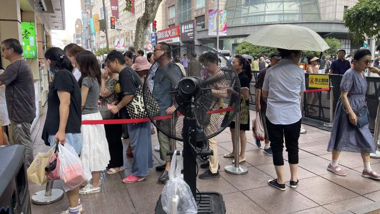 记者注意到,由于天气炎热,一些商家摆出了大电风扇,对着户外排队的人群吹,还有的发起了小扇子,为大家防暑降温。