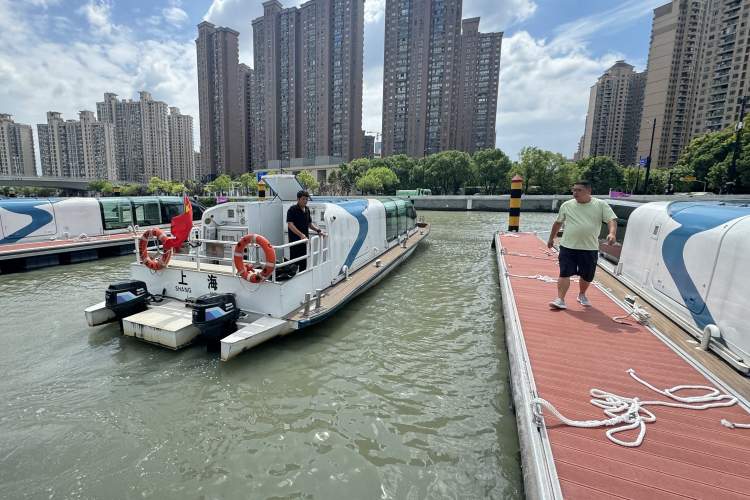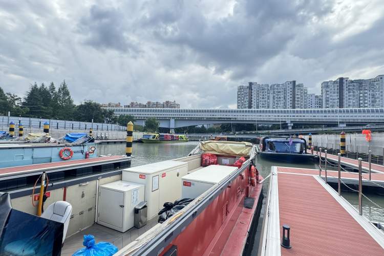 今日上午,记者赶赴位于丹巴路的苏州河游船码头母港,看到11艘苏州河游船正有序地靠岸,各类游船已停止充电,小型敞篷式上海印象游船纷纷收起遮阳帘靠岸;大型游船则分散停靠,保持安全距离,以防风力增大导致的漂移或碰撞。数名工作人员正在码头上来回检查,监控室内安保人员全天候值守。
