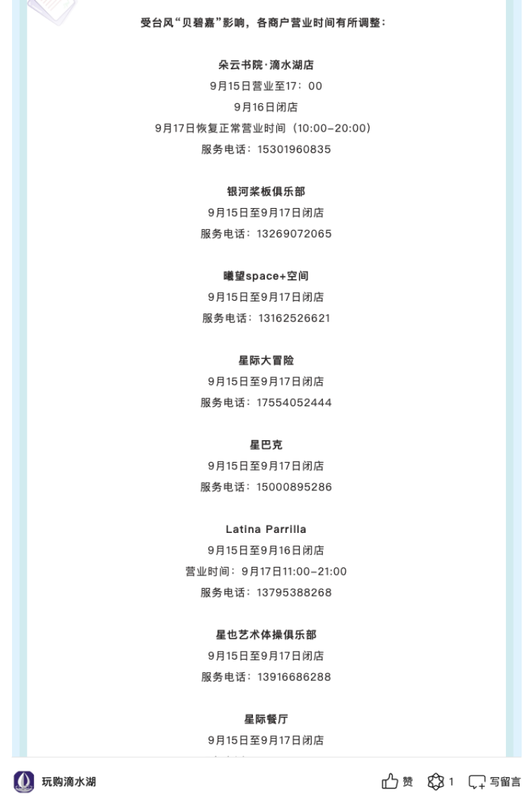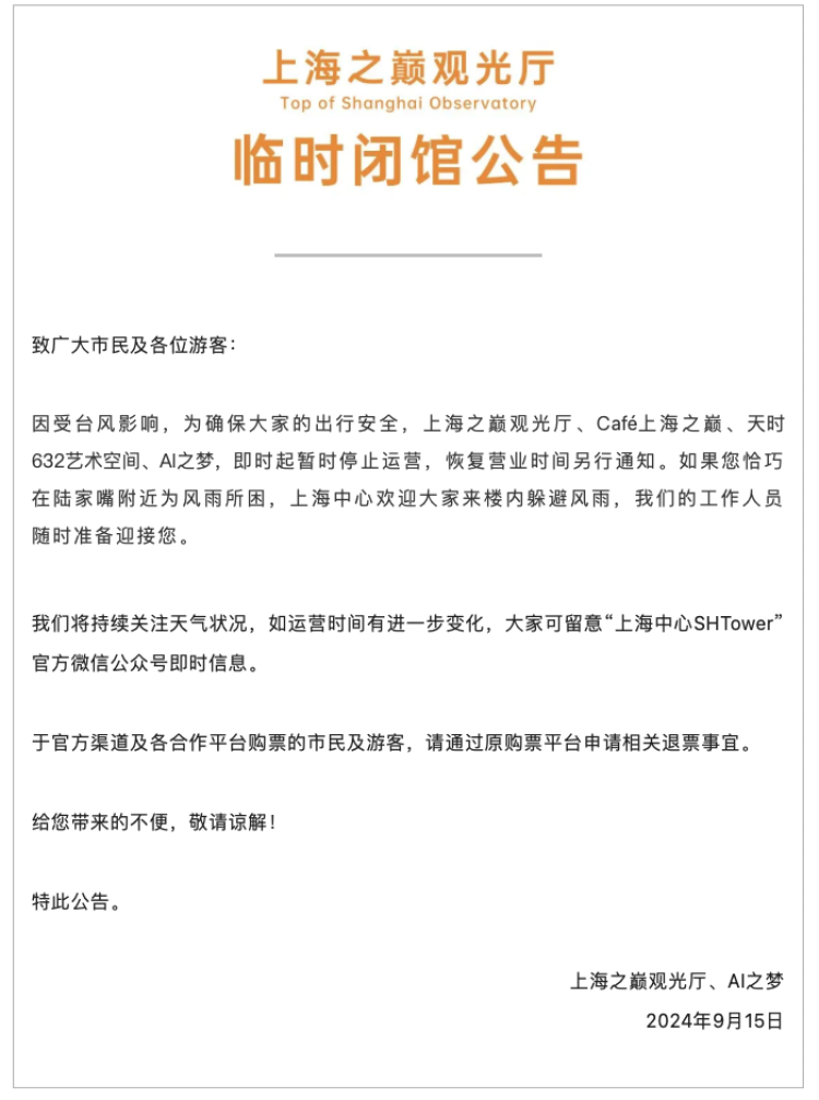 受台风影响,上海之巅观光厅、滴水湖商户等处发布关闭公告 唐玮 2024-9-15 来源:周到上海 随着全市防汛防台响应行动更新为II级,上海之巅观光厅、滴水湖商户等处发布关闭公告。 上海之巅观光厅、Café上海之巅、天时632艺术空间、AI之梦,即时起暂时停止运营,恢复营业时间另行通知。 朵云书院·滴水湖店、一号营地等滴水湖商户调整营业时间。 来源:周到上海 作者:唐玮 赞一个 (0)