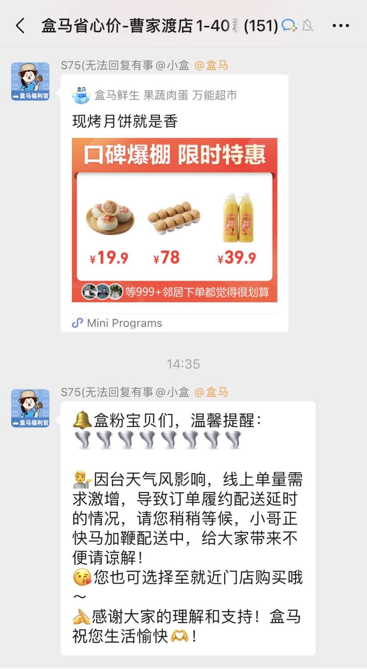 “物流方面,我们也做了部署,预估中秋三天的线上单量会比平时高出30%以上,也会提前储备运力,确保做好台风履约保障,同时台风天也会做好骑手安全、加油包福利保障,确保我们的快递员平安送货。”盒马相关人士表示,针对骑手,一方面检查骑手车辆是否正常运转,并准备备用车辆、备用电池。另一方面,门店检查好骑手防雨工具装备,提供一次次性手机防水袋、吹风机、烘干机使用。
