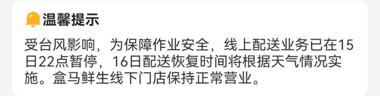 盒马app提示,已于15日22点暂停配送,16日配送恢复时间将根据天气情况实施。