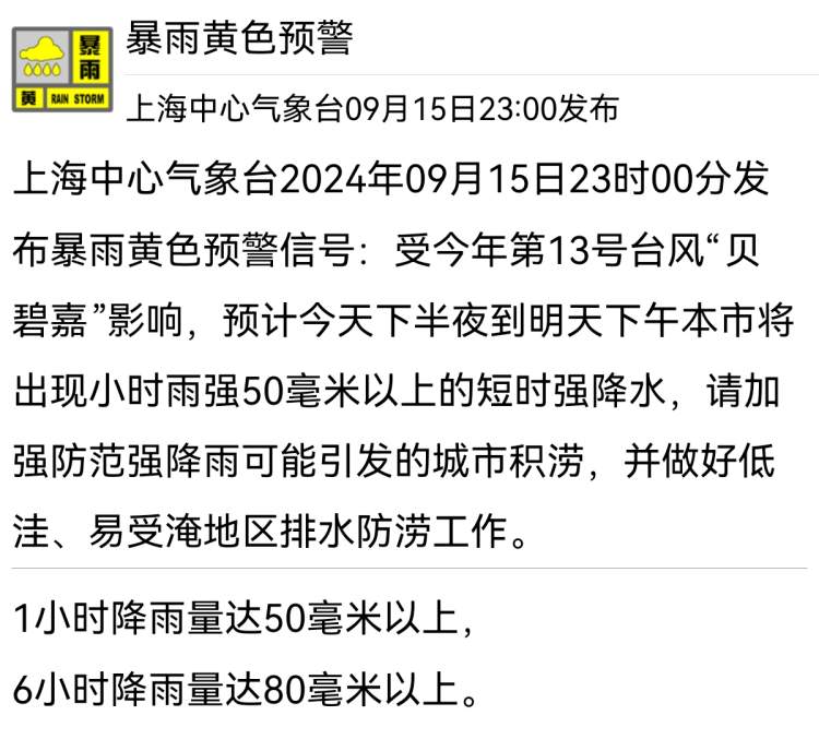 上海发布暴雨黄色预警!目前“一橙一黄”预警高挂 徐妍斐 2024-9-15 来源:周到上海 随着“贝碧嘉”的靠近,上海中心气象台9月15日23时00分发布暴雨黄色预警信号: 受今年第13号台风“贝碧嘉”影响,预计今天下半夜到明天下午本市将出现小时雨强50毫米以上的短时强降水,请加强防范强降雨可能引发的城市积涝,并做好低洼、易受淹地区排水防涝工作。 目前,本市台风橙色预警、黄色暴雨预警同时高挂。 来源:周到上海 作者:徐妍斐 赞一个 (0)