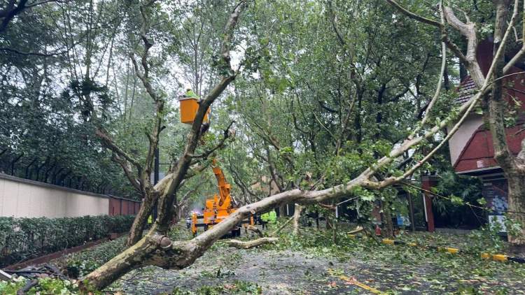 与此同时,在徐汇区复兴西路靠近武康路,有2棵悬铃木倒伏,绿化抢险队伍赶到现场后发现,旁边3棵悬铃木也有倒伏可能性,于是,对5棵悬铃木进行了截枝清运的措施。