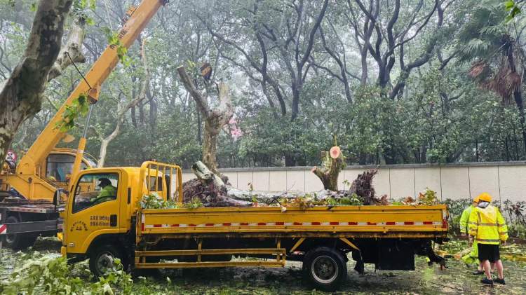 今天上午,在建国西路靠近岳阳路,一棵巨大的悬铃木倒伏,徐汇园林发展有限公司应急抢险队伍第一时间出动。相关负责人介绍,由于台风还在肆虐,倒伏的行道树扶正后容易再次发生倒伏风险,所以,抢险队伍直接采取了将树枝截断,将树干用大吊车吊运到车上,清运移走的措施,尽快恢复道路交通。