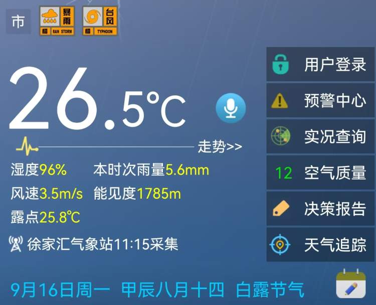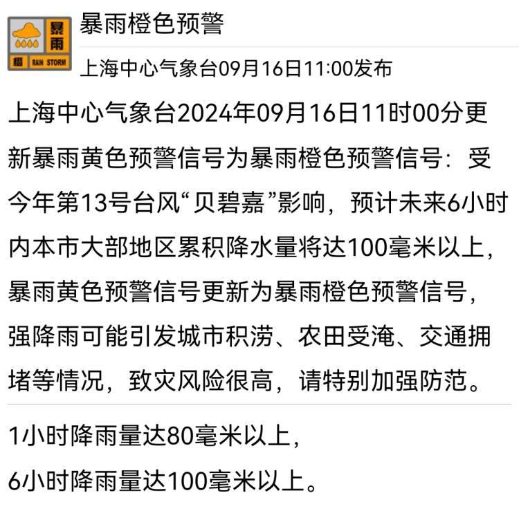 上海中心气象台2024年09月16日11时00分更新暴雨黄色预警信号为暴雨橙色预警信号: