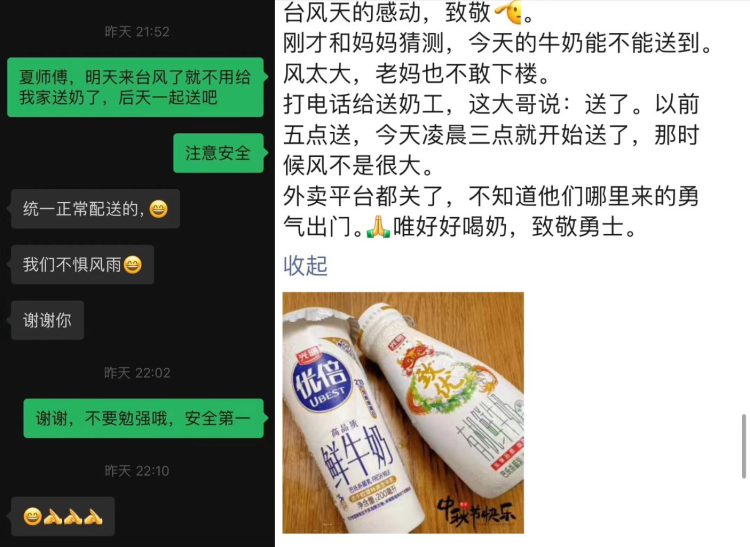 “其实,有客户直接给我们发来消息,表示台风来了可以延缓送奶。我们很感动,更加觉得,只要条件允许,还是要把每天早上的‘光明’准时送达。”光明随心订相关负责人分享了来自部分消费者的微信,“这是消费者对我们的关心和信任,更加坚定了我们要服务好每一位消费者的信心。”
