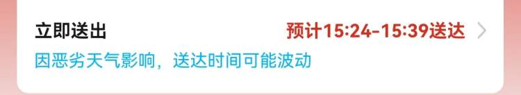 饿了么也可以选择“立即送出”。同样提醒:因恶劣天气影响,送达时间可能波动。