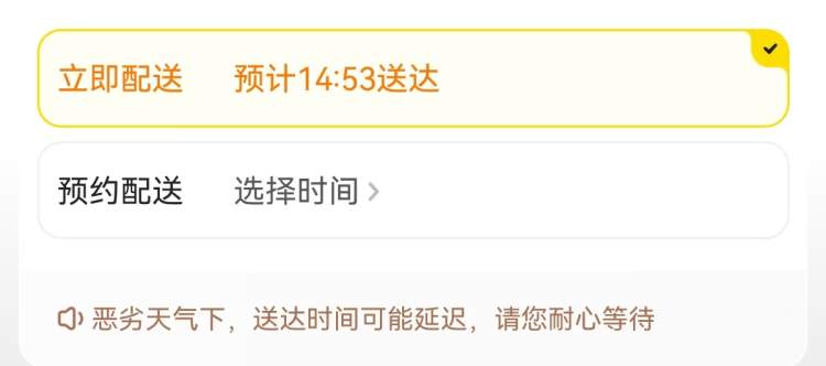 美团外卖可选择立即配送。但提示恶劣天气下,送达时间可能延迟。