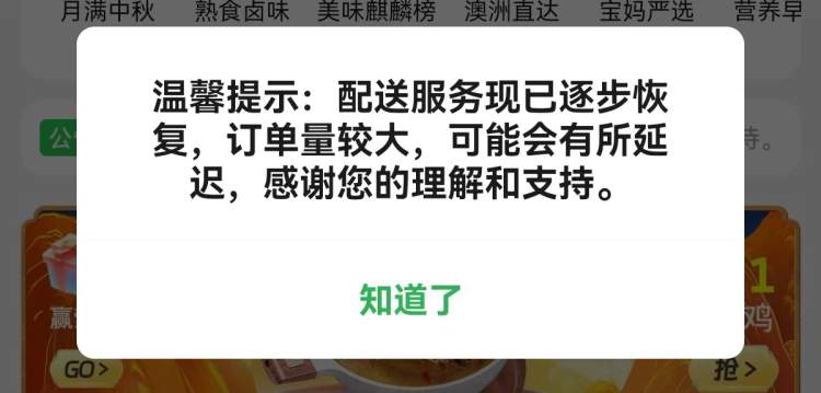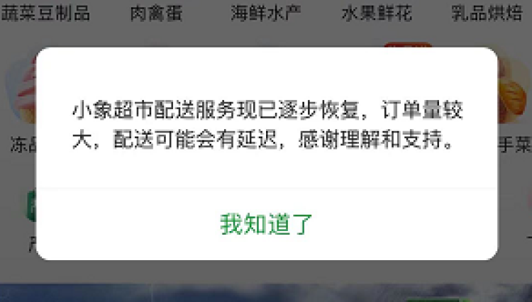 小象超市也显示,配送服务已逐步恢复,订单量较大,配送可能会有延迟。