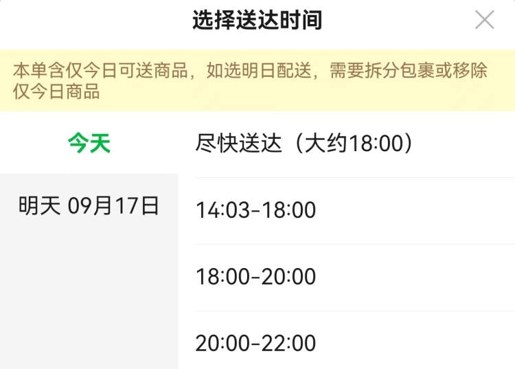 今日若选择“尽快送达”,送达时间大约18时。