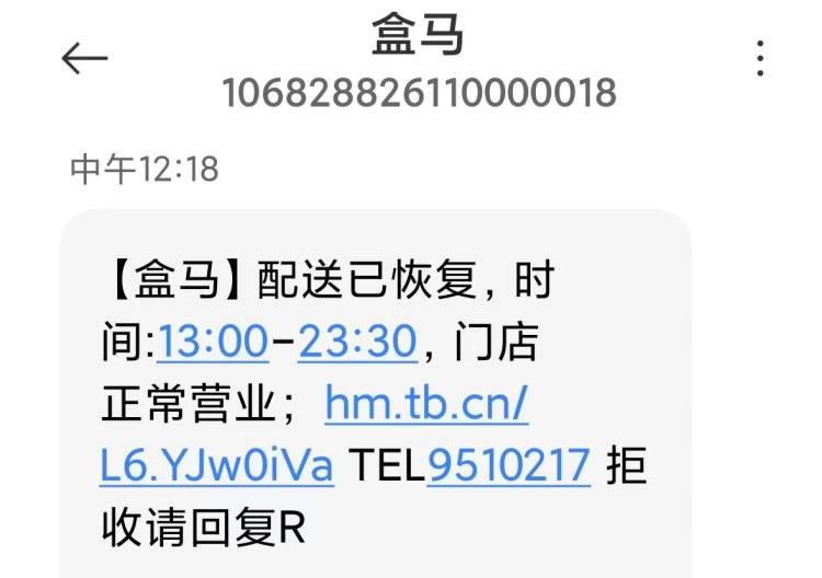 中午时分,一些上海地区的盒马用户收到短信,提示今日配送已恢复,时间将从13时持续至23时30分。