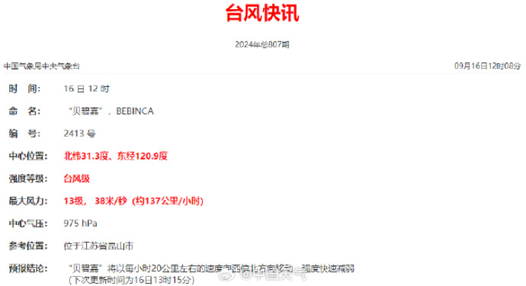 今年第13号台风“贝碧嘉”自早晨7时30分登陆上海临港新城沿海后,其中心从西南面一路横穿上海,带来越强越强的风雨。不过据市气象局及中国天气网的消息,16日12时,贝碧嘉的台风中心已位于江苏昆山境内,下一站无锡。